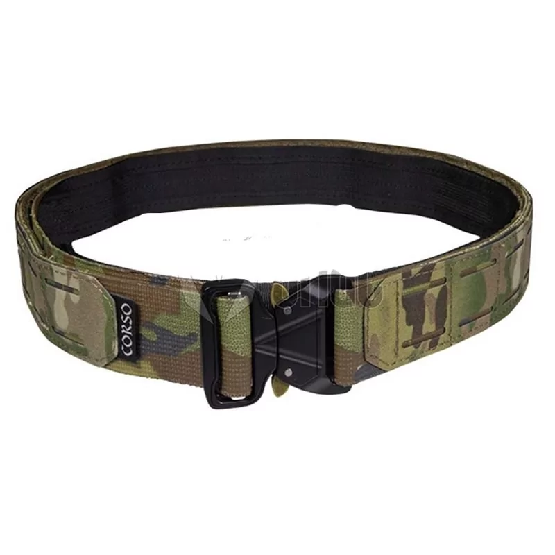Ceñidor de la marca Corso modelo Hook laser Mk1, un primer línea con 2 hileras con corte láser para más capacidad de carga y poder albergar pistolera y varios pouch en la cintura, con hebilla metálica estilo "cobra"