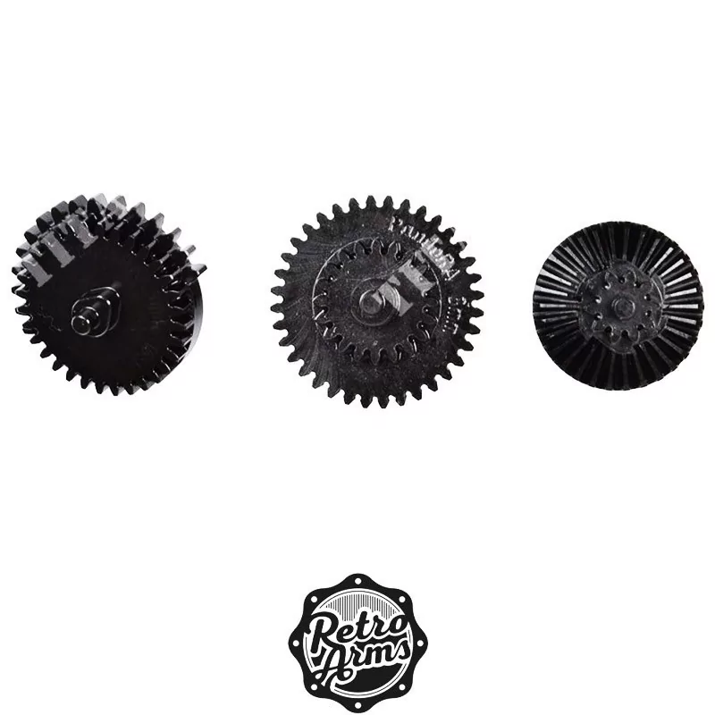 Engranajes totalmente mecanizados con CNC de acero endurecido de alta calidad para réplicas de airsoft. Probado en resorte M210 en nuestra caja mecánica con nuestro pistón y otras piezas de la familia Retro Arms con miles de rondas.