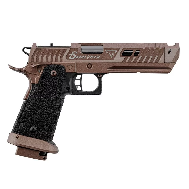 Pistola fabricada por Army Armament, bajo licencia oficial de Taran Tactical Innovations, la GBB Sand Viper es una réplica de airsoft de la pistola de combate de 9 mm utilizada por John Wick en el Capítulo 4 de la saga cinematográfica.