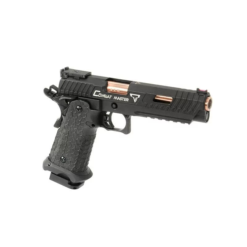 ¡La icónica pistola de John Wick 3! Pistola John Wick 3 TTI Combat Master. Fabricada en metal y ABS con marcajes reales licenciados. Incluye tactical magwell, botón de cargador sobredimensionado y nozzle reforzado. ¡Rendimiento superior con blowback!