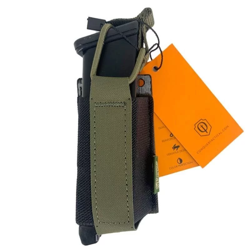 Conquer nos presenta este portacargador de capacidad simple de corte laser. Este modelo soporta cargadores de pistola convencionales y caben diferentes tipos de cargadores gracias a su parte interna con algo de elasticidad que los mantiene bien sujetos y facilita la extracción. Está fabricado en nylon 500D y 12 capas de material TEGRIS que le da un toque de rigidez en la parte trasera, además de mayor resistencia y durabilidad. En la parte superior disponemos del clásico sistema con cincha elástica para una fácil y cómoda manipulación, donde destaca la velocidad de extracción para recargar rápido. Se coloca mediante sistema molle trasero de una línea, por lo que es perfecto para cinturones, chalecos y porta cargadores de mayor tamaño con molle.