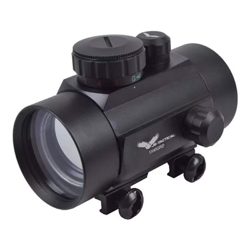 Punto rojo JS-Tactical de 40 mm, color negro, ajustable a railes de 20 mm. Metal, 5 niveles de brillo, incluye pila CR2032.