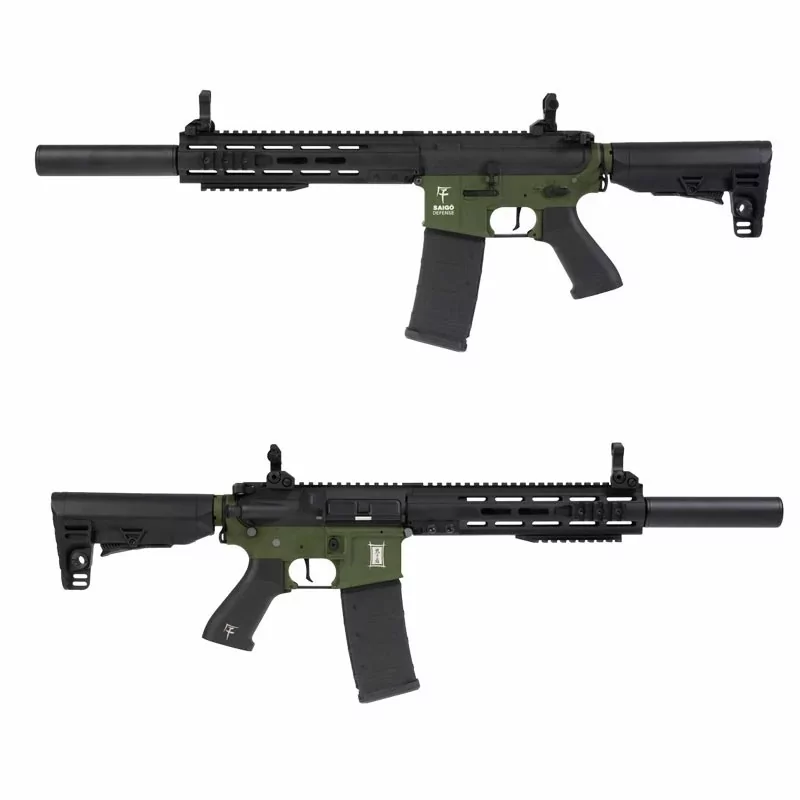 La Bushido CHU Verde/Negro de Saigo Defense con gatillo electrónico y mejora Maple Leaf ofrece una combinación perfecta de precisión, velocidad y rendimiento. Ideal para quienes buscan controlar cada disparo con alta eficiencia en el campo.